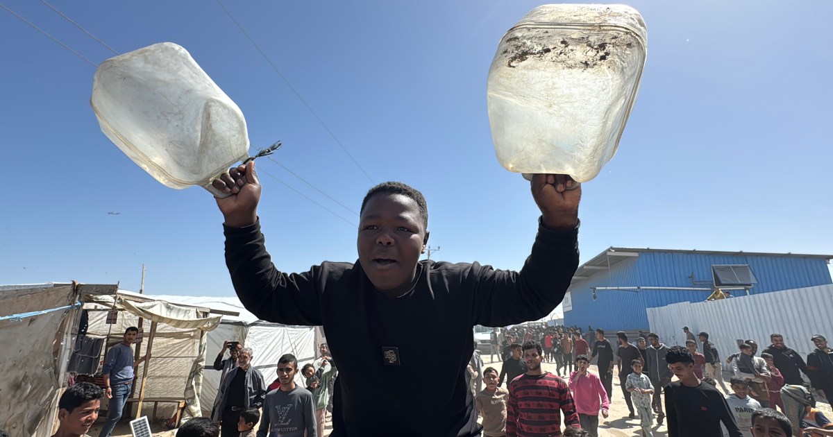 Khan Younis, Gaza Strip – Nawaf al-Akhras begins his day by carrying bottles and jerrycans with his eldest son to a water filling station about one and a half kilometres (0.9 miles) from his tent in southern Gaza’s al-Mawasi camp.