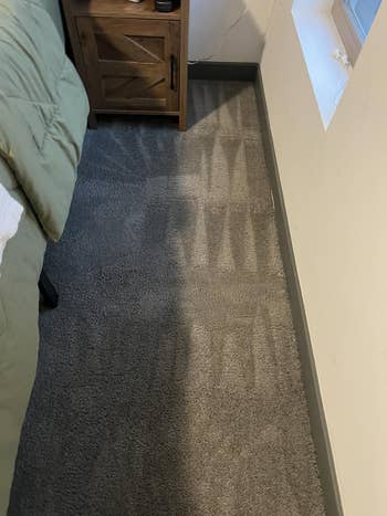 Jenae says, "I've been using this trapper mat for a long time now, and while it's pretty much impossible to eliminate all litter from your home if you own even one cat, let alone many, this mat has made keeping the floor of my litter box room MUCH more manageable. Unlike other mats, where the litter just kind of sits on top and eventually gets kicked elsewhere, this mat is designed so that the litter falls through the holes and stays inside the mat until you're ready to dump it. It's made out of an EVA material that's supposed to be gentle enough for cat paws, and my two kitties don't seem to have a problem walking on it. I *highly* recommend getting one of the larger sizes (I have the 30-by-24-inch mat) to extend the coverage area — I initially got the smallest one but went back for a larger size and it's perfect. Note that the mat will probably have a fold down the middle when it first arrives, but just give it some time and weigh it down with something if needed; it'll lay flat."