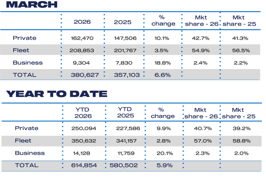 The UK new car market grew by 6.6% in March, typically the busiest month of the year, with 380,627 new vehicles registered, according to the latest figures published by the Society of Motor Manufacturers and Traders (SMMT). The performance marks the best March – and best month overall – since 2019. Growth was driven primarily by private demand, with retail registrations rising 10.1% to 162,470 units. Fleet registrations increased 3.5% to 208,853 units, while the smaller business sector grew 18.8% to 9,304 units. March was also the best month on record for electrified vehicle volumes, accounting for 196,059 registrations, underlining the impact of manufacturers’ investment in road transport decarbonisation. Plug-in hybrid (PHEV) registrations rose 46.9% to take a 13.0% market share, while hybrid electric vehicles (HEVs) increased 7.3% to take 15.8% of the market. Battery electric vehicles (BEVs) reached a new record, up 24.2%, to 86,120 registrations in the month. However, with a market share of only 22.6% for the month, and 22.4% year to date, the SMMT notes that uptake is now even further adrift of the Zero Emission Vehicle (ZEV) Mandate target, which demands 33% for 2026. Despite rising EV volumes, conditions have diverged sharply from those assumed when the mandate was set. At the start of 2026, battery costs were more than 30% higher than expected and industrial energy prices around 80% above 2021 levels, while public charging can cost over 140% more than five years ago. Future costs and, therefore, demand are even more uncertain given the Iran crisis, which may spark interest in EVs but risks pushing up energy and supply chain costs, increasing the cost of living and undermining consumer confidence. While government has acknowledged these pressures – and sought to support the market, most notably through the introduction of the Electric Car Grant – manufacturers are still forced to shoulder unsustainable costs to comply with the regulation when natural demand lags ambition. Alongside billions invested in both the technology and product to deliver a choice of more than 160 EV models, manufacturers are relying heavily on discounting to stimulate demand. Industry’s calls for a rapid review of the transition have been given added urgency by geopolitical events. While other major international markets are revising their transition plans to reflect geopolitical and market realities, delays to a review of the UK transition will put the country in an uncompetitive position, undermining consumer choice, investment and, ultimately, the pace of decarbonisation. Mike Hawes, SMMT Chief Executive, said: “The strongest new car market since 2019, with the highest ever volume of EV registrations, is a boost to the industry and the economy. However, the headlines belie the costs incurred and the challenges involved. Much of March’s performance will be from orders placed before the start of the Iran conflict, which threatens to raise the cost of living, undermining consumer confidence. Against this backdrop, and with the EV market falling further away from mandated levels despite record levels of incentives, an urgent review of the transition is required to secure a sustainable market, economic growth and the UK’s net zero ambitions.” The Jaecoo 7 - from Chery's Jaecoo brand - was the top selling model in the UK new car market in March, outselling the Ford Puma in second spot. "UK car market enjoys bumper March" was originally created and published by Just Auto, a GlobalData owned brand. The information on this site has been included in good faith for general informational purposes only. It is not intended to amount to advice on which you should rely, and we give no representation, warranty or guarantee, whether express or implied as to its accuracy or completeness. You must obtain professional or specialist advice before taking, or refraining from, any action on the basis of the content on our site.