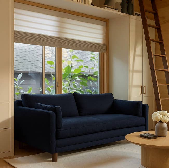 Promising review: "The sofa's deep blue color pops! It is firm but also soft, allowing us to snuggle into it. Long enough to sleep on, this sofa will be fought over in my family!" —Anne-marie