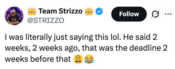 I’m gonna be thinking about this for at least the next two weeks. As a Senior Lifestyle editor at BuzzFeed, I cover stories about health, home, politics, and relationships, with a special focus on work and money. Jimmy Kimmel on Trump extending his Iran deadline: "It's always two weeks. He's like a conscientious employee. He always gives two weeks' notice." Cue the supercut: pic.twitter.com/4vwvtr2ObK "We're signing a health care plan within two weeks. A full and complete health care plan, that the Supreme Court decision on DACA gave me the right to do" -- Trump routinely cites a two week timeframe for new policy initiatives when he's just making stuff up pic.twitter.com/qTItTafxEV "I'll tell you in about two weeks" -- Trump on a TikTok deal pic.twitter.com/zwtn3nEHMG Trump on the war in Gaza: "I think in the next two to three weeks you're gonna have a pretty good conclusive ending." pic.twitter.com/Is5OacS2IK “Two weeks.” Trump says he’ll reveal details of his Greenland plan “in two weeks”. Two weeks is his constant self-imposed deadline, that he often doesn’t meet. Remember when he promised his health care plan “in two weeks” during his first term? pic.twitter.com/FDaP5Z3wNL a reporter points out to Leavitt that Trump says something will happen in "two weeks" all the time and then it doesn't happen 🙃 pic.twitter.com/IEWCZ4mXtG