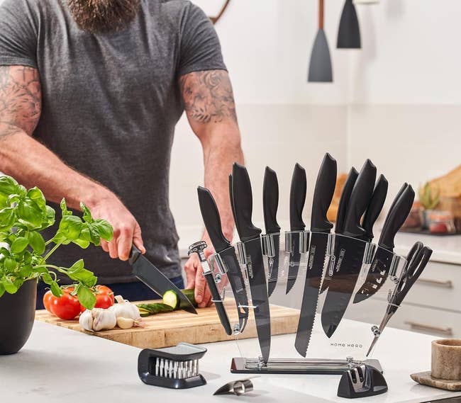 The 20-piece set comes with 14 knives, acrylic stand, a pair of kitchen scissors, a peeler, a two-stage knife sharpener, a knife guard, and a cleaning brush.