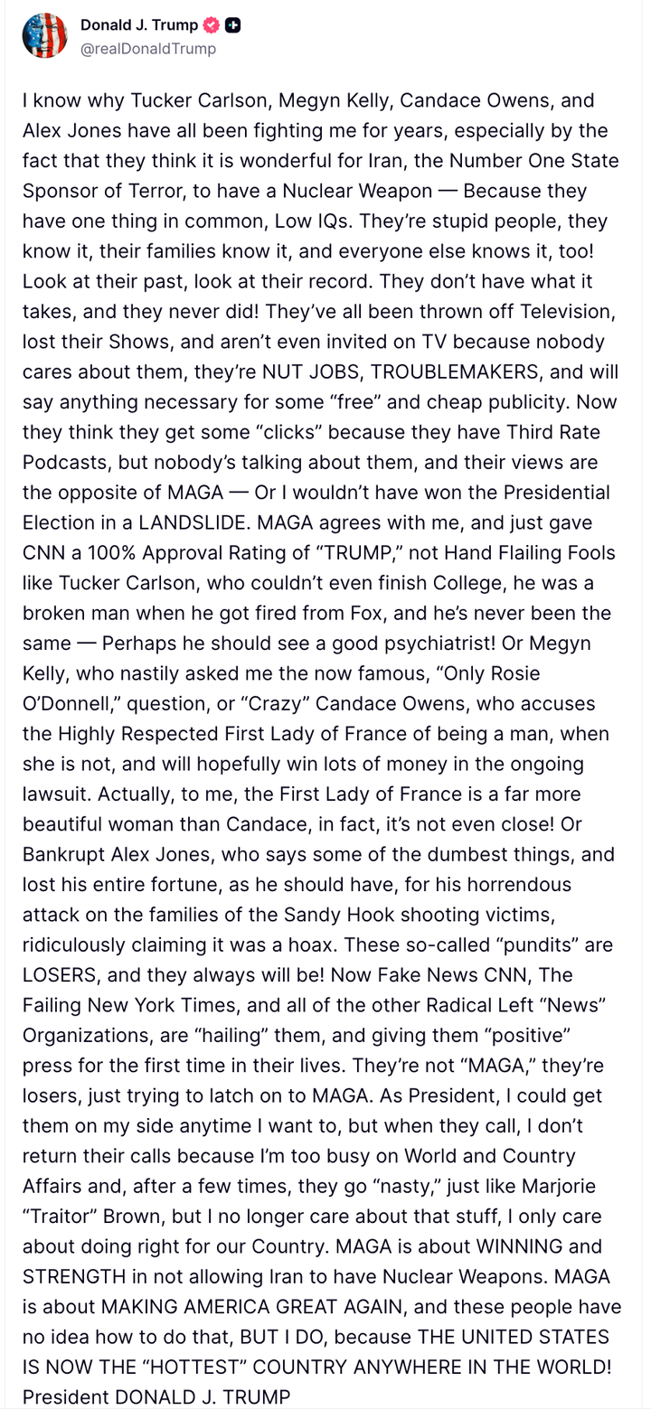 We’re eager to see what these MAGA mouthpieces’ spins are going to be on this post. In a comically lengthy Truth Social post published Thursday, President Donald Trump talked some serious smack about a few very prominent right-wing personalities — including Megyn Kelly, Alex Jones, Candace Owens, Tucker Carlson and former Rep. Marjorie Taylor Greene (R-Ga.)— who dared to disagree with him on Iran. And if you don’t believe us about the length, here’s a screenshot. Trump began his novella of a post by using the nuclear weapon excuse to defend his decision to attack Iran, and then moving on to say that Carlson, Kelly, Owens, and Jones all “have one thing in common, Low IQs.” “They’re stupid people, they know it, their families know it, and everyone else knows it, too!” Trump wrote. Trump then moved on to mock their careers by pointing out that several have been “thrown off Television, lost their Shows, and aren’t even invited on TV.” And then — we can’t believe we’re actually writing this — Trump kind of cooked while explaining why. “Because nobody cares about them, they’re NUT JOBS, TROUBLEMAKERS, and will say anything necessary for some ‘free’ and cheap publicity,” he wrote. The president moved on to write very personalized attacks for each of them. First up was Carlson, who was fired from Fox News in 2023. “Hand Flailing Fools like Tucker Carlson, who couldn’t even finish College,” Trump wrote. “He was a broken man when he got fired from Fox, and he’s never been the same — Perhaps he should see a good psychiatrist!” Then he moved on to Kelly — whom he’s clashed with in the past. “Or Megyn Kelly, who nastily asked me the now famous, ‘Only Rosie O’Donnell,’ question,” Trump wrote. His remark was a reference to a 2015 GOP debate Kelly moderated in which Kelly asked Trump about his misogynistic rhetoric towards women on social media, with Kelly saying he’s referred to women as “‘fat pigs,’ ‘dogs,’ ‘slobs’ and ‘disgusting animals.’” “Only Rosie O’Donnell,” Trump interjected at the time. Next up in Trump’s meltdown was “‘Crazy’ Candace Owens” — and Trump did not mince his words while trashing the conspiracy theory Owens has been peddling on her podcast since 2024 about how France’s First Lady Brigitte Macron is a man — which prompted the first couple to file a defamation lawsuit against Owens in 2025. “[Owens] accuses the Highly Respected First Lady of France of being a man, when she is not, and will hopefully win lots of money in the ongoing lawsuit,” Trump wrote. “Actually, to me, the First Lady of France is a far more beautiful woman than Candace, in fact, it’s not even close!” Trump then dug into “Bankrupt Alex Jones.” “Who says some of the dumbest things, and lost his entire fortune, as he should have, for his horrendous attack on the families of the Sandy Hook shooting victims, ridiculously claiming it was a hoax,” the president wrote. Trump called all these “so-called ‘pundits’ LOSERS, and they always will be!” and criticized “Radical Left ‘News’ Organizations” for “‘hailing’ them, and giving them ‘positive’ press for the first time in their lives.” And this is when Greene — who had a falling out with Trump over the release of Jeffrey Epstein files last year and has been criticizing ever since — got pulled into this mess. “They’re not ‘MAGA,’ they’re losers,” Trump wrote about Carlson, Kelly, Owens and Jones. “Just trying to latch on to MAGA. As President, I could get them on my side anytime I want to, but when they call, I don’t return their calls because I’m too busy on World and Country Affairs and, after a few times, they go ‘nasty,’ just like Marjorie ‘Traitor’ Brown, but I no longer care about that stuff, I only care about doing right for our Country.” After claiming everyone he listed as having “no idea how to” actually be MAGA, he said: “MAGA is about WINNING and STRENGTH in not allowing Iran to have Nuclear Weapons,” Trump wrote. “MAGA is about MAKING AMERICA GREAT AGAIN, and these people have no idea how to do that, BUT I DO.” He concluded by writing, “THE UNITED STATES IS NOW THE ‘HOTTEST’ COUNTRY ANYWHERE IN THE WORLD!” before signing off the post with his name and title. By entering your email and clicking Sign Up, you're agreeing to let us send you customized marketing messages about us and our advertising partners. You are also agreeing to our Terms of Service and Privacy Policy.