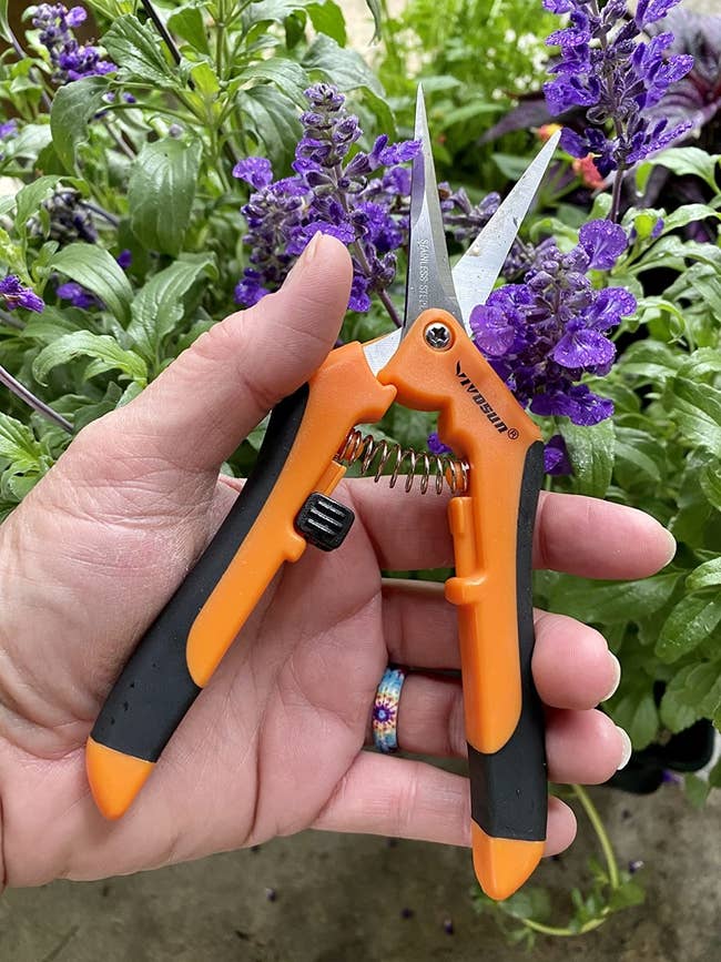 Promising review: "I needed something sharp and small enough for deadheading smaller blooms, but that would also do well with any size of bloom. These are my new favorite pair. They're sharp and easy to use. The small push lock that keeps the blades closed is very easy to unlock and relock. I would highly recommend these to any gardening professional or hobbyist like me." —JoJo