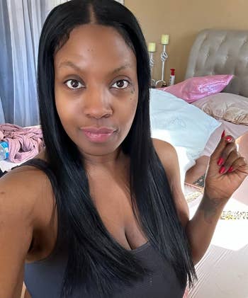 "I have 4a–4b curls. When my hair is straight, there are a few spots that are a little frizzier than others which to me, isn't a big deal. Some flyaways however were the biggest reason why I got this. It lays the baby hairs and is a little bit of a heavier product. I will say, you just have to be careful if you're not used to using heavy product. The first time I used it, I just put a little in my hands and then put it where it was needed." —Jay
