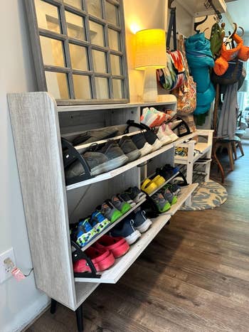 Promising review: "Our front entry room has been a minefield of shoes all over the floor. I nagged and pestered my kids and husband to stack their shoes on our tiny shoe shelf or to take shoes they don’t use much to their rooms, but still, there was a pile. And I had no idea what to do about it. Until I saw a reel of a shoe cabinet like this one! Our whole family is using it, and my entry room floor is finally shoe-free. The shelf is beautiful. It went together easily, and the drawers closed perfectly. It has completely solved this problem for me. I am obsessed with my new shoe cabinet, and I highly recommend it to anyone. One word of caution: My husband has size 10.5 (in men’s) feet, and his shoes have to go in at sort of a diagonal to make them fit, and I think he can only get five or six pairs into his drawer. I wear size 10.5 in women’s, and mine fit just fine." —Jeri