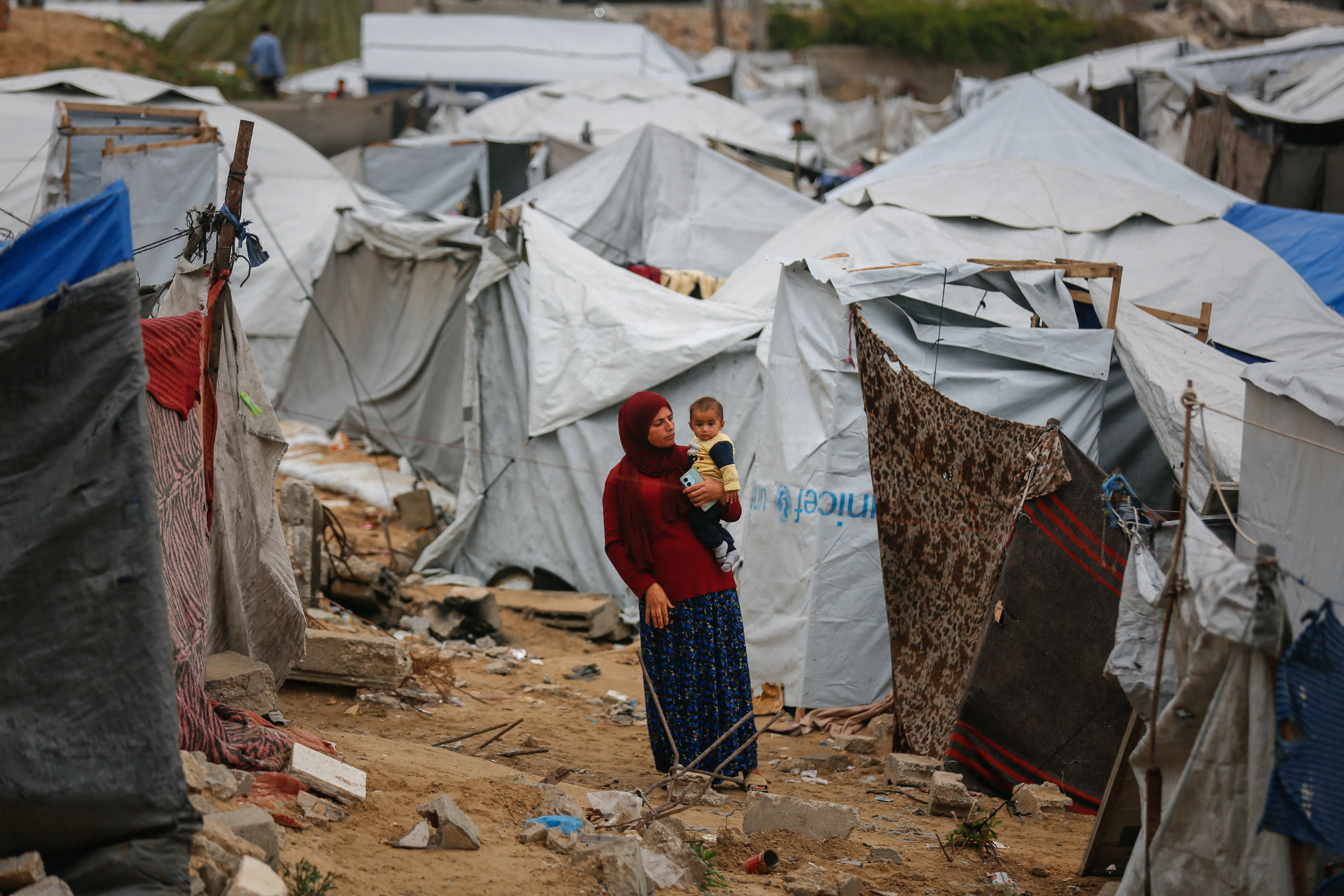 A woman hugs her child among the tents at a makeshift camp for displaced Palestinians in the Gaza Strip, on April 1, 2026. Most of Gaza's 2.4 million residents have been displaced, many of them multiple times, during the war that began after Hamas's October 7, 2023, attack on southern Israel, with concerns growing over conditions in the tented camps.