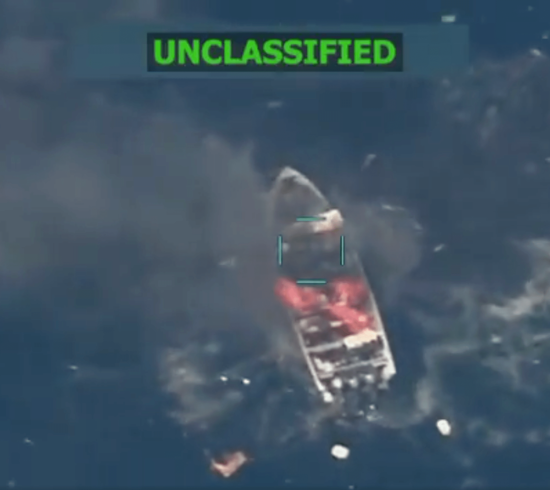 A grainy video clip released with the statement shows a stationary boat with outboard engines and what appear to be floats from fishing nets nearby. The boat comes under attack from the air and explodes into flames.