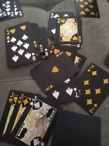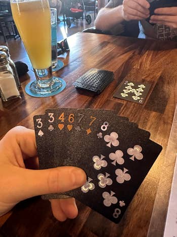 Promising review: "These playing cards look really nice — the black design gives them a premium feel compared to regular decks. The cards are sturdy and shuffle smoothly, and the waterproof material is a big plus since you don’t have to worry about spills ruining them. The numbers and symbols are clear and easy to read, even with the darker style. They feel durable and hold up well after several games. Great deck for poker nights or just casual games with friends. Definitely a fun upgrade from standard cards." —Jesus Enriquez