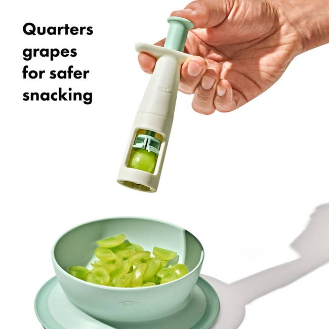 Grapes, tomatoes, and other small fruits and veggies are choking hazards until AGE FOUR. FOUR. I was shocked when I learned that. Since you're going to be cutting grapes and tomatoes for a long time, you might as well make it easier on yourself.