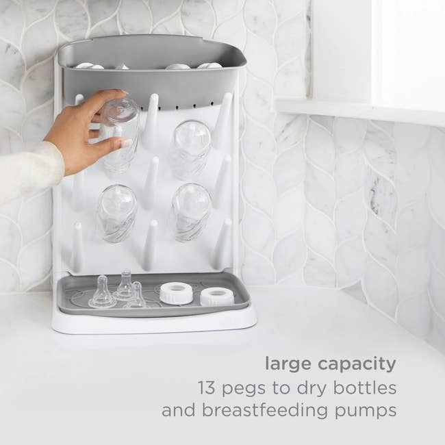 Promising review: "This is the perfect rack for next to the sink so I can wash the bottles and let them drip dry before loading them into the sanitizer. The top bin is great for the nipples. Bottom tray slides off to rinse, and I use it to hold a separate sponge for just bottle washing." —Debra