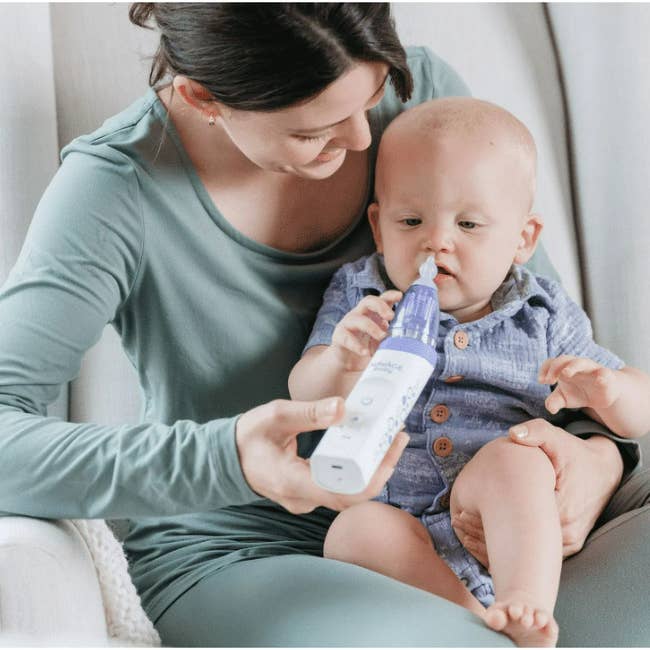 Promising review: "No more sore throats using a manual type by mouth. This aspirator has three speed settings, three nasal tips, a light, and plays music! My little one was scared at first, naturally, but once she got used to it, she now asks for it when her nose is bothering her. The battery lasts a long time on one charge. The tips are made of rubber and are easy to clean. The reservoir cup holds a lot, along with the overflow cup. All pieces are easy to take apart (twist) and clean. Highly recommend and will be buying this as a baby gift for others!" —Alicia