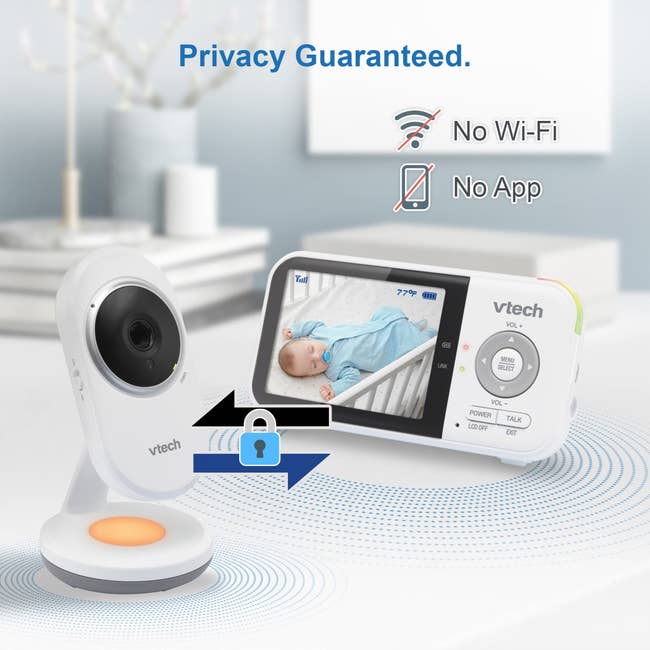 This monitor is simple — it's a camera and a screen — but has some great features, including two-way talk-back, night vision, an optional night-light, and a temperature sensor. I used this brand for both of my babies and loved it. I saw too many horror stories of Wi-Fi being hacked that I put my little postpartum anxiety self at rest. I loved that I didn't need an app and the simplicity of it all. Can't complain about the price either!