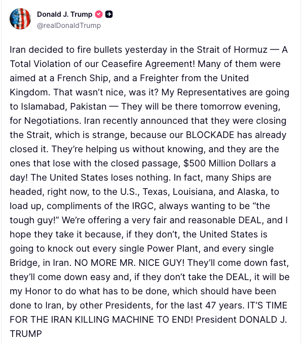 Over the weekend, the U.S. attacked and seized an Iranian-flagged cargo vessel that it said had tried to evade its blockade of Iranian ports. Iran’s joint military command vowed to respond, and its Foreign Minister Abbas Aragchi told his Pakistani counterpart that American threats to Iranian ships and ports were “clear signs” of Washington’s disingenuousness ahead of the planned talks, Iran state media reported.