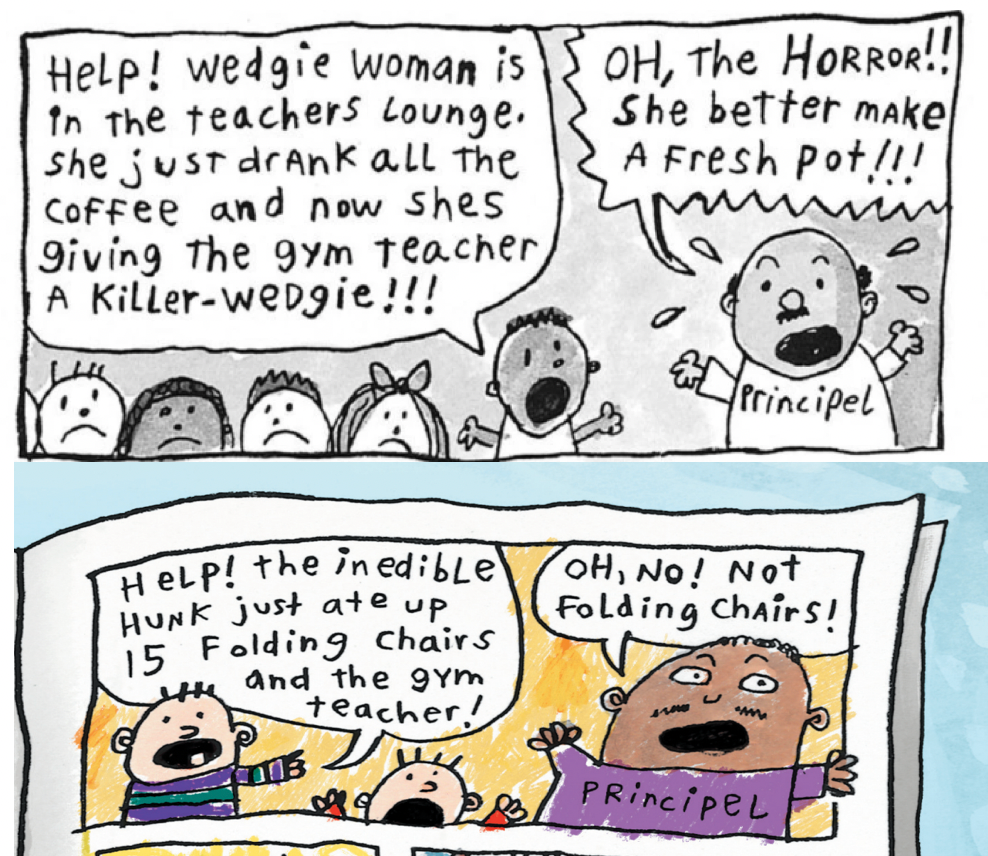 Dav: I did most of the Captain Underpants books the traditional way: pencils, inks, and I applied a gouache and watercolor wash to give the illustrations tone. The last Captain Underpants book I did digitally, but I still painted the black-and-white wash by hand with actual gouache and watercolor. I hand-paint the covers with acrylics.