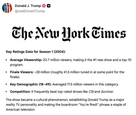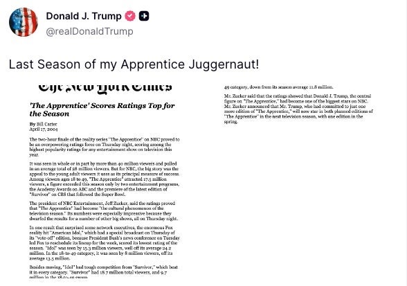 “Late Show” host Stephen Colbert on Wednesday said President Donald Trump has found an unusual way to lash out as his popularity continues to plunge. The latest polls show his approval dropping to just 32%, driven largely by dissatisfaction with how he’s handling the war in Iran and inflation. Trump took to social media to share a much more favorable number instead. “In response to his sinking poll numbers, today Trump posted a New York Times article praising ‘The Apprentice’s’ ratings from April of 2004,” Colbert pointed out. Indeed, the president shared a two-decade-old Times report about his season 1 ratings on Truth Social: Then, three minutes later, he also shared a summary of that same 2004 New York Times article on “The Apprentice” ratings: Colbert read between the lines. “Always a tip off that life isn’t going great for you when you start to brag about something from 22 years ago,” he pointed out. “You kids think dad’s a loser? Well, I’ll have you know that back in high school, I once won two free tickets to see the Spin Doctors in Anaheim at the Grove.” See more in his Wednesday night “Late Show” monologue: Former HuffPost journalist Ahmed Shihab-Eldin has been detained for days in Kuwait. He must be freed immediately. Learn more here. Credit: Grace Rivera By entering your email and clicking Sign Up, you're agreeing to let us send you customized marketing messages about us and our advertising partners. You are also agreeing to our Terms of Service and Privacy Policy.
