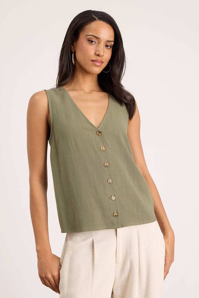 Promising review: "I knew going into this that it is pretty cropped, so I pair it with high-waisted jeans. It fits perfectly! Buttons don't pull over my chest, which I hate. Fabric doesn't feel cheap. Want to buy in other colors!" —Maki P.