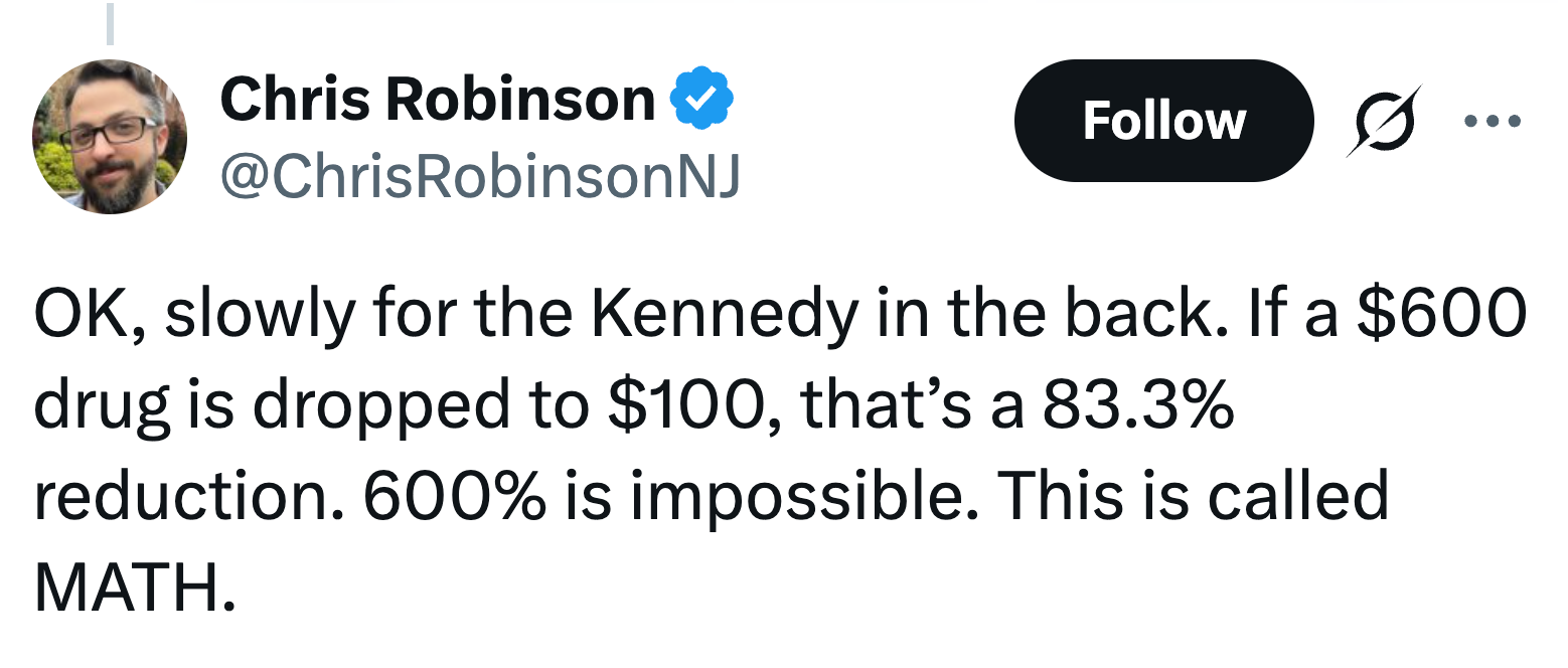 RFK Jr: "President Trump has a different way of calculating percentages. If you have a $600 drug and you reduce it to $10, that's a 600% reduction." pic.twitter.com/MjDNADqc8p