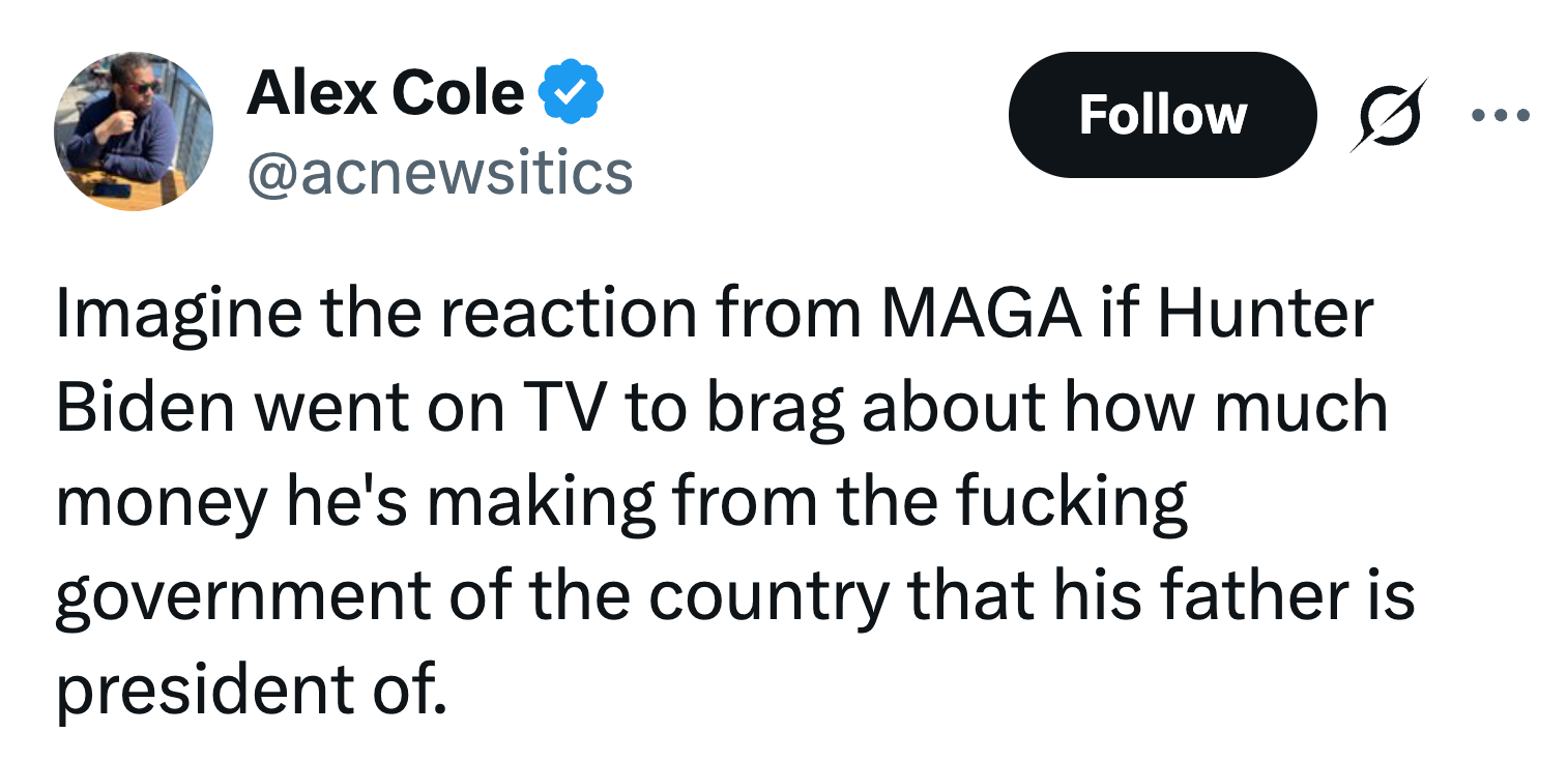 Eric Trump -- the president's son -- is on Maria Bartiromo's show bragging about one of his companies landing a $24 million Pentagon contract pic.twitter.com/9V8z3E9GDc