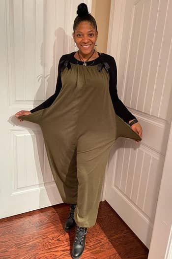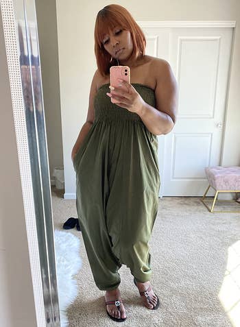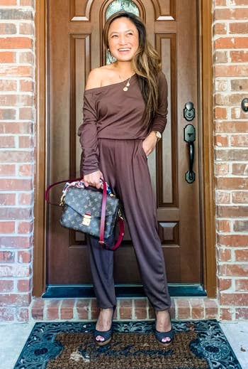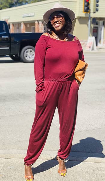 Promising review: "Y'all. If heaven were a piece of clothing, it would be this jumpsuit. The fabric is so buttery soft and it is so cute and chic. You can easily dress it up with accent jewelry and some cute shoes, or nap in it. It has a cute boat neck cut, but if you leave the top keyhole unbuttoned you can achieve the hanging off the shoulder look. It is the perfect amount of baggy. Will definitely be re-ordering in other sizes. This is a new staple piece in my closet." —Rachel Landrum