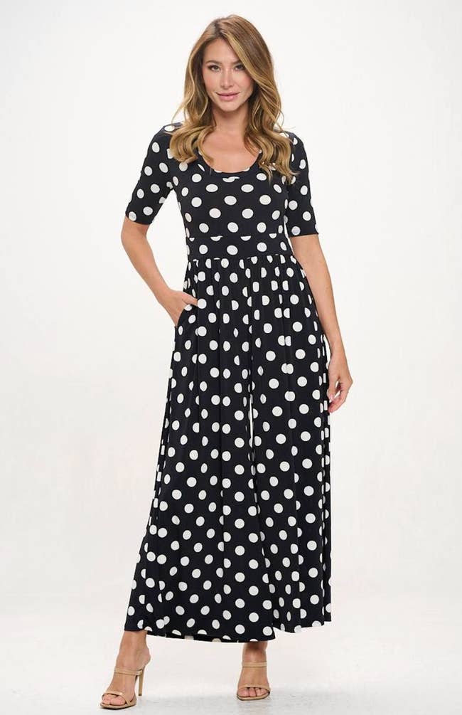 Promising review: "I am obsessed with this jumpsuit. Perfect for teaching in, has pockets, very stretchy, easy to pull off and on. Thin to medium weight, so it is not hot on me and perfect for spring and summer. Has a 25-inch inseam, but the crotch sits lower on me, and I am 5’2”. Hits perfect for me — I can still wear a sandal, and this barely grazes the floor. I love wearing this layered at the moment with fitted long sleeve T-shirts. Nothing fancy, but it is adorable, and I kept getting compliments from students as well. I do wear an underwear shaper with this to smooth me out, but this feels like wearing pajamas. I have these in a size large. I am 150 pounds, 5’2”. I just ordered another pair and will have them in four different colors. Highly recommend." —sebn1111
