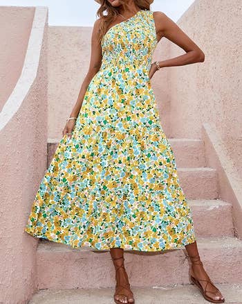 Promising review: "Gorgeous spring dress! I absolutely love this dress! It makes me feel like I want to go into a field of flowers! 🌻🌻 Great stretch, and not too see-through. You might want to put something underneath if your too afraid but I was perfectly fine." —Abigail Rivera