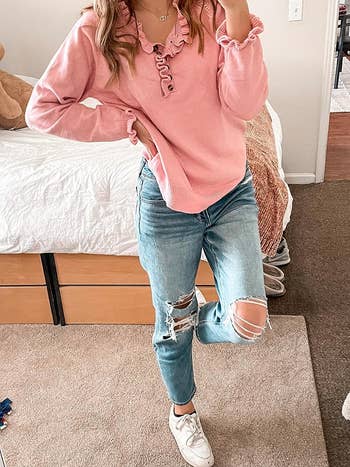 Promising review: "Very fashionable for winter and spring. This sweater is just as cute in person. Color is what I expected. Fit is good for my weight and height. Very soft, and ruffles and buttons are just right. Not too frilly." —Mms