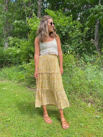 Promising review: "I am EMOTIONAL about how great this is. But I want to wear this every day. If I were in a cartoon, I would want this to be the outfit that I have a closet full of. I have G-cup boobs, and tube tops are my own personal hell. But, somehow, this sat just right. I wore a strapless bra under it, and I'm just so excited to wear this out. Did I mention the skirt is perfect? It’s kinda long, but I wore it with some platform-y wedges, and it made it look even cuter! Who gave me permission?!" —Sara