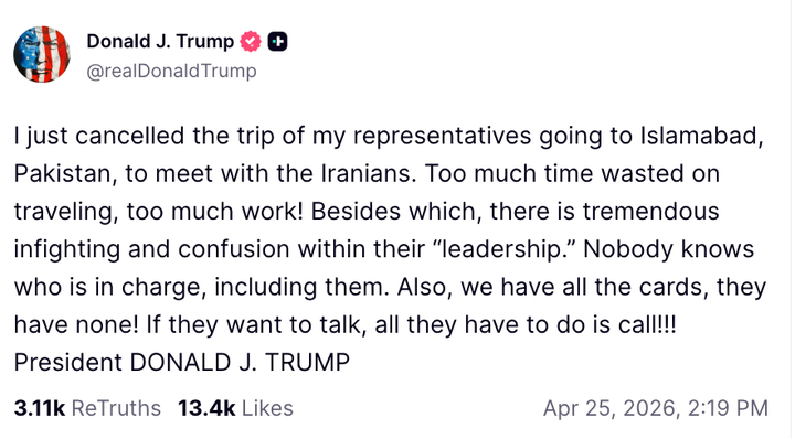 President Donald Trump told reporters Saturday that after he canceled in-person ceasefire talks between U.S. envoys and Iranian leaders, Iran presented better terms in just “10 minutes.” “They gave us a paper that should have been better,” he said of Iran’s initial proposal. “And, interestingly, immediately when I canceled it, within 10 minutes, we got a new paper that was much better.” The president said earlier in the day that he had told Steve Witkoff and Jared Kushner not to travel to Pakistan to negotiate with Iranian officials. Iran’s Foreign Minister Abbas Araghchi, who left Islamabad on Saturday evening as the planned talks broke down, wrote on X, “Have yet to see if the U.S. is truly serious about diplomacy.” Trump shared his rationale for canceling the face-to-face talks in a social media post of his own. “Too much time wasted on traveling, too much work!” he wrote Saturday afternoon on his Truth Social platform. He added, “If they want to talk, all they have to do is call!!!” By entering your email and clicking Sign Up, you're agreeing to let us send you customized marketing messages about us and our advertising partners. You are also agreeing to our Terms of Service and Privacy Policy.