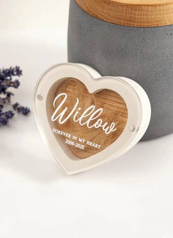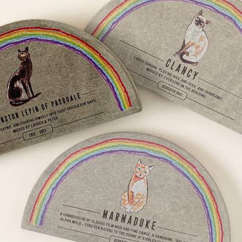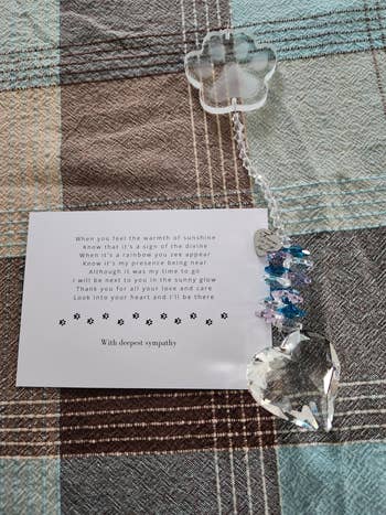 We hope you love our recommendations! While every product is independently chosen by our editors, BuzzFeed and our publishing partners may collect a share of sales or other compensation from the links on this page. You can read more about how our affiliate partnerships work in our Editorial Standards & Ethics Guide. When words fail, sometimes a meaningful gift can say everything instead. I'm a resident writer, cat mom, and obsessive online shopper who is passionate about quirky pet products, home decor, size-inclusive fashion, and, above all, perfumes. One of the joys of life is the bond we as humans share with our pets, and when we lose them, those bonds don't just go away. And while it's not easy to know exactly what to say when a friend has to say goodbye to a beloved pet, a kind gift can go a long way during a tough time. So whether you're looking for a book to help a friend process their loss, a personalized garden stone for an outdoor memorial, or a piece of jewelry so that they can always keep their fur baby close, we've compiled some of the most meaningful gifts you can give to a friend in need. They'll appreciate it more than you could know. A custom pet portrait to turn a cherished photo of their pet into a physical, framed piece of art that's more than just decor — it's a memorial for their dearly departed best friend, too. To get started, hit "customize now" and you'll pick your frame material, select the number of pets, upload images of the pet(s), add in their name(s), choose a font, choose a background color, and choose between five dimensions. You'll also provide your email address for potential questions about your order. Also, you can get it without the frame if you want. Be sure to use high-res images for the best results. Haus and Hues is the small business behind these gorgeous custom portraits. Promising reviews: "I bought this portrait as a gift for my husband who recently said goodbye to his childhood cat. When I opened it today to set it up for him, I was moved to tears by how beautiful it was. It is the most gorgeous portrait of our beautiful, dearly missed angel. I can't thank this company enough for the amazing gift they gave us. Thank you." —Hannah Dobbin "I was nervous to order this because I didn’t think it would turn out well but it turned out AMAZING! Everyone who’s seen it LOVES it and it is now the star piece of decor in our house! If you’re on the fence, just get it!" —Kelly Get it from Amazon for $29.99 (or get a frameless one for $14.99). A hand-painted watercolor portrait to express your deepest empathy when words just can't. This beautiful tribute is so much more personal and thoughtful than just a store-bought sympathy card — it'll immortalize their furry friend in a way that captures all those little quirks and charming details that made their pet who they were. Alex Yer Art is a New York-based small biz that makes beautiful watercolor galaxy-inspired pet portraits by hand. BuzzFeed Shopping editor Jenae Sitzes says, "I can't recommend this artist enough for pet portraits, as I've been fortunate to have not one but two (!!) art pieces commissioned from her, shown above. The first was a surprise from my sister-in-law after my dear kitty Maggie passed away, and the second was a piece I commissioned for my mom after our beloved family cat Jasper finally crossed over the Rainbow Bridge as well. The pieces are simply gorgeous in person, and the artist, Alex, is so friendly and communicative — you just send her a few good photos of the cat and explain what colors you want in the painting. Though many of her portraits have a more abstract galaxy background, she'll also add special touches from a specific photo if requested, like both of mine above." Promising review: "This was a gift for someone who lost their dog and it was beyond perfect. Alex does an amazing job and I can’t recommend their work enough!" —Callie Get it from Alex Yer Art on Etsy for $75+ (available in three sizes). A laser-engraved crystal ball with an included stand, which is a gorgeous but subtle option for anyone who had the privilege of loving, and therefore the hardship of losing, their best feline friend. This little sculpture can be displayed just about anywhere (like a nightstand, desk, or shelf), so whether they'd prefer to keep their grief private or don't mind creating a more public memorial, this is a gift they will cherish for years to come. Promising review: "I bought this for a friend whose cat passed away. I will say it is quite small but the detail is beautiful and the stand is metal and very sturdy. Overall great quality and she loved it. I would definitely buy again." —Melissa Get it from Amazon for $9.99 (available in four styles). A heart-shaped keepsake box with a personalized, plexiglass lid and a beautiful wooden base, so they can keep their pet's fur in a safe and secure place (the lid has a strong magnetic closure) for years to come. You don't have to send the seller any fur, so there's no need to worry about it getting lost in transit or asking the bereaved to part with it. You'll also get a digital proof through Etsy messages to make sure that the box comes out just right. Luna Lottus is a small business specializing in pet loss products. Jenae says, "I purchased this for myself after losing my beloved boy Sneaky, as I wanted a safe place to store some of his fur, and I didn't want to have to *mail* away that precious fur to be sealed inside, as is the case with some keepsake products. The seller sent me a mockup right away, and my order shipped literally the next day. The box was lovely and just as I expected it to be, and crucially, the magnets on the lid are strong enough that I don't worry about it coming apart accidentally and letting any fur loose. The personalized design on the lid is also a beautiful touch." Promising review: This was the perfect piece to put my pup's fur in. It's beautiful and well-made. Thank you so much for m