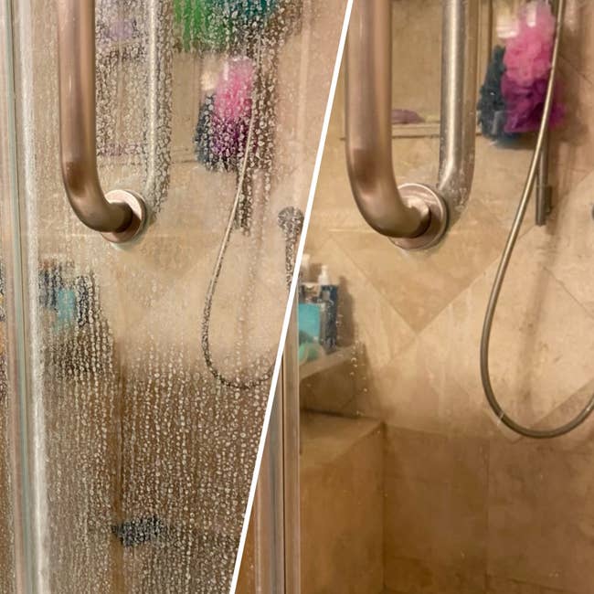 Promising review: "I thought my hard water stains would never come off my shower doors, but I bought this awesome brush set, and it's amazing! I’ve tried all the hacks — drier sheets, clean erasers, lemon, vinegar — nothing works like this brush! I used Zep shower cleaner with it! In the picture, the side on the right is the part of the door I cleaned, and I still have to clean the left side." —Traci D.